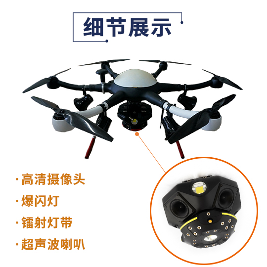QN-02型無人機驅鳥器是自主研發生產的無人機掛載驅鳥產品,由高音喇叭、超聲波喇叭、攝像頭、360°旋轉爆閃射燈等構成,日夜皆可工作。適配市場多款型號的飛行平臺。
