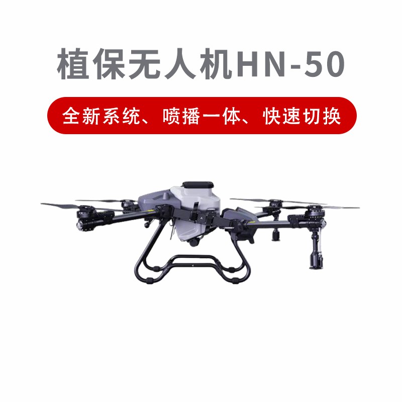 HN-50型農業植保無人機,集成噴播雙系統快速切換技術,適配多樣化作業場景。搭載大流量葉輪泵與水冷式離心噴頭,霧化粒徑精準可調,藥液覆蓋均勻細密;配備精密超聲波流量計,實現藥液分離檢測,噴灑誤差小,藥效利用率高。播撒系統采用360°傘狀金屬攪盤,出料均勻流暢,顆粒播幅達8米,支持種子、肥料等多物料拋撒。