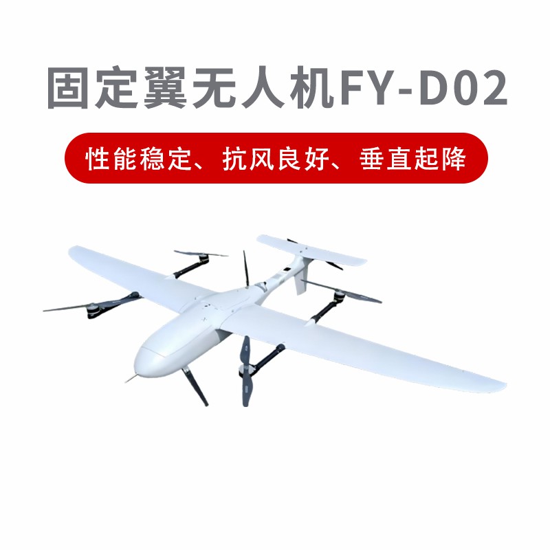 垂直起降固定翼無人機FY-D02型,采用熱壓罐成型的全復合材料打造,機身、機翼與垂直起降臂各有適配材質。具備垂直起降能力,動力系統強勁,搭配高性能電池。飛行性能穩定,飛行與巡航速度可觀,抗風能力良好,續航時間長。外形設計合理,翼展與機長比例協調,機腹有一定離地間隙。在特定海拔、飛行高度與風力條件下,掛載后仍能保持穩定的巡航表現。